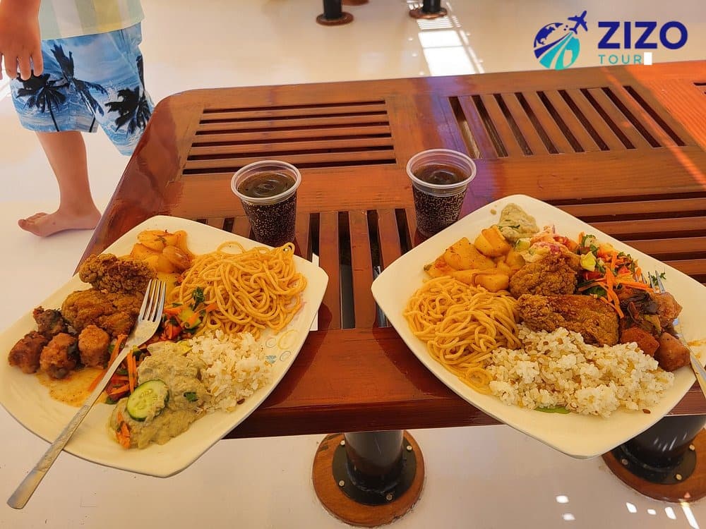 Delicious buffet lunch onboard with soft drinks and seasonal fruits.